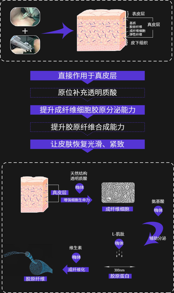 以透明质酸为母液(搭载多种氨基酸、L-肌肽和维生素等)注射至真皮层满足颈部肌肤的营养补给、填充组织容量缺失